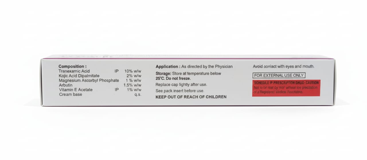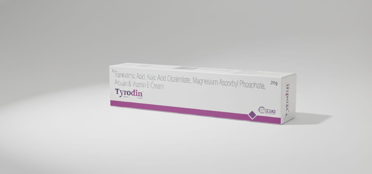 Tyrodin cream is a skin-brightening formulation designed to reduce dark spots, melasma, and uneven pigmentation. It combines tranexamic acid, kojic acid dipalmitate, arbutin, and antioxidant vitamin E.